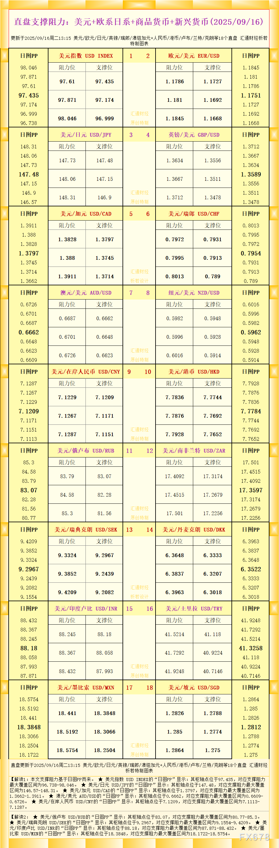 汇通财经APP讯——一张图看直盘支撑阻力:美元+欧系日系+商品货币+新兴货币,更新于2025年9月16日周二13:15,具体美元/欧元/日元/英镑/瑞郎/澳纽加元+人民币/港币/卢布/兰特/克朗等18个直盘,更多详见汇通财经析若特制图表中的内容。
