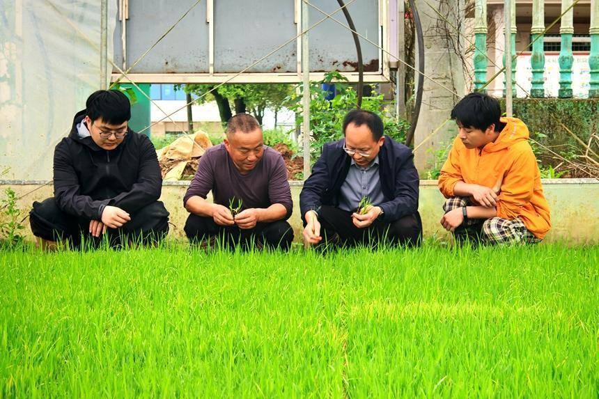 育秧大棚外,几名研究生正蹲在田边,记录秧苗生长数据。田埂旁的实验室里,师生们忙着分析样本、优化技术。
